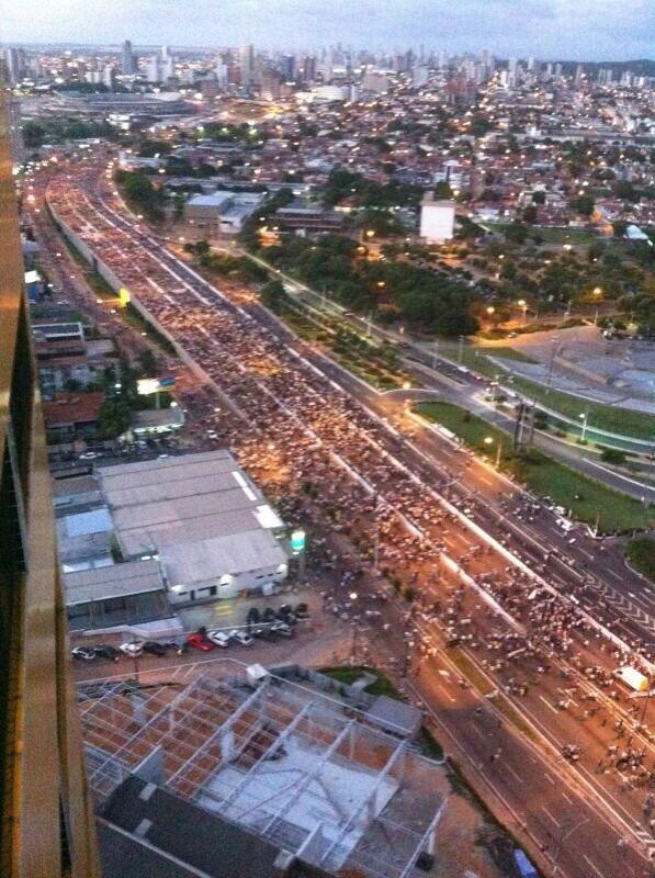 | 15h55 Aproximadamente 4.000 pessoas já estão na BR-101. Trânsito bloqueado sentido centro e livre sentido aeroporto |